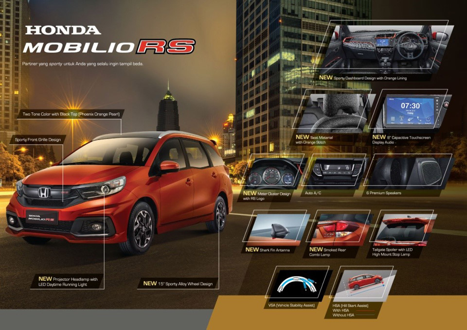 New Honda Mobilio grade RS (CVT & M/T) hadir dengan seluruh fitur di New Honda Mobilio grade E (CVT & M/T), ditambah dengan fitur-fitur baru termasuk New 15" Sporty Alloy Wheel Design, New Shark Fin Antenna, New Smoked Rear Combi Lamp, New Sporty Dashboard Design with Orange Lining, New 8" Capacitive Touchscreen Display Audio with Bluetooth, Hands Free Telephone & Smartphone Connection, New Meter Cluster Design with RS Logo.